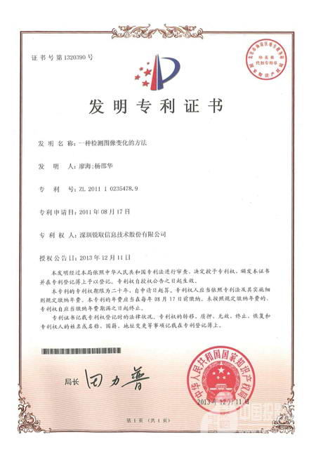 國家知識產(chǎn)權(quán)局于2013年12月11日授予銳取《一種檢測圖像變化的方法》發(fā)明專利證書。