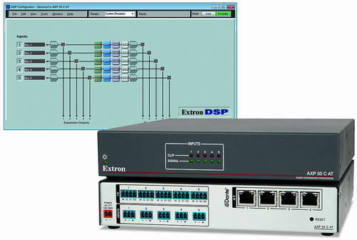 Extron 電子很高興地推出了 AXP 50 C AT,這是一款 5 路輸入音頻擴(kuò)展處理器,具有 Extron ProDSP 功能,可將遠(yuǎn)端麥克風(fēng)和其它信號(hào)源集成到支持 Dante™ 的 Extron DMP 128 音頻系統(tǒng)。通過(guò)單根以太網(wǎng)電纜可將多臺(tái) AXP 50 C AT 設(shè)備鏈接到中央設(shè)備,節(jié)省了為每一路麥克風(fēng)單獨(dú)鋪設(shè)電纜所需的人工和費(fèi)用。AXP 50 C AT 為麥克風(fēng)/線路輸入提供 48 V 的幻像電源。并為每路輸入提供專用的信號(hào)處理,包括增益、濾波、動(dòng)態(tài)調(diào)整和回聲消除(AEC)功能。使用直觀的 DSP 配置器(DSP Configurator)軟件能快速和輕松地對(duì) AXP 50 C AT 的 DSP 參數(shù)和回聲消除進(jìn)行設(shè)置。