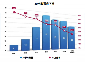 3D票房的急劇下滑,尤其是全球市場3D票房的下滑,引發(fā)了電影產(chǎn)業(yè)越來越多的關(guān)注。制片人、工作室和影院來說,3D影片曾經(jīng)被認(rèn)為是一種革新的強(qiáng)大平臺,能創(chuàng)造和展示如臨其境且極富沖擊感的內(nèi)容。然而,由于影片內(nèi)容對消費(fèi)者吸引力不足,導(dǎo)致3D票房回收率急速下滑。