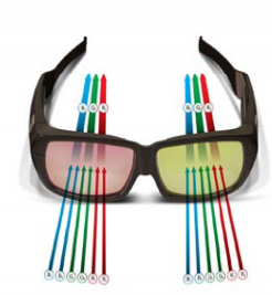 另外一種用于低增益白幕的解決方案采用了現(xiàn)有的分色3D技術(shù)。此方法的優(yōu)點(diǎn)是,銀幕上的圖像是利用紅、綠、藍(lán)原色的合成而創(chuàng)造的。專門設(shè)計的眼鏡能從穿過每只眼的光中濾出特定波長的光。通過合成RGB原色(R1G1B1)而產(chǎn)生一只眼睛的圖像。利用不同的原色(R2G2B2)來產(chǎn)生另一只眼的圖像,從而保證每只眼只能看見正確的圖像。
