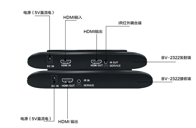 BV-2322同樣分為兩個(gè)部分:發(fā)射端和接收端。發(fā)射端連接電腦、藍(lán)光機(jī)這些設(shè)備,接收端主要是連接顯示設(shè)備,如電視、投影機(jī)。從背部接口上,我們可以看到這款無線影音傳輸器采用HDMI接口,顯然,傳輸1080p高清畫面是毫無問題的。另外,BV-2322還配有紅外耦合接口,這樣我們在看藍(lán)光電影的時(shí)候,可以直接用藍(lán)光機(jī)的遙控器在接收(顯示)端控制藍(lán)光機(jī)。