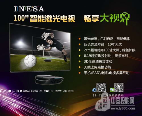 作為2014年視頻行業(yè)一大熱點(diǎn)INESA儀電電子出品的百寸3D激光電視也因其真實(shí)自然的百寸大屏以及內(nèi)置的安卓智能操作系統(tǒng),成為現(xiàn)代智能生活概念中不可或缺的重要組成部分,受主辦方力邀參加了本屆展會(huì)。儀電電子將展出該款產(chǎn)品正投應(yīng)用-客廳電視與側(cè)投應(yīng)用兩大方案。