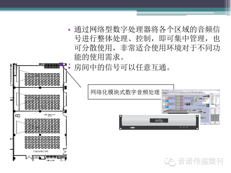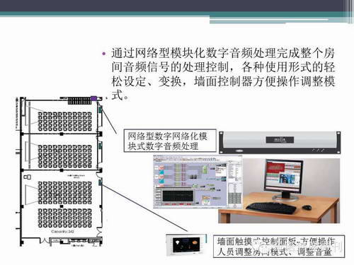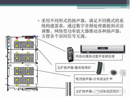 1.音頻系統(tǒng)均以數(shù)字化音頻處理器為核心,系統(tǒng)構(gòu)建方式:音源(PC音頻、討論性會(huì)議話筒、無(wú)線話筒)+數(shù)字音頻處理器(矩陣、分頻、分配、反饋抑制、均衡調(diào)節(jié)、自動(dòng)混音等)+功率放大器(多通道)+壁掛揚(yáng)聲器+吸頂揚(yáng)聲器,具有操作簡(jiǎn)單、易懂等特點(diǎn),改變了傳統(tǒng)音響系統(tǒng)操作繁瑣、系統(tǒng)設(shè)備繁多等狀況。配合集中控制系統(tǒng)控制數(shù)字音頻處理器來(lái)調(diào)整系統(tǒng)模式、音量等功能。