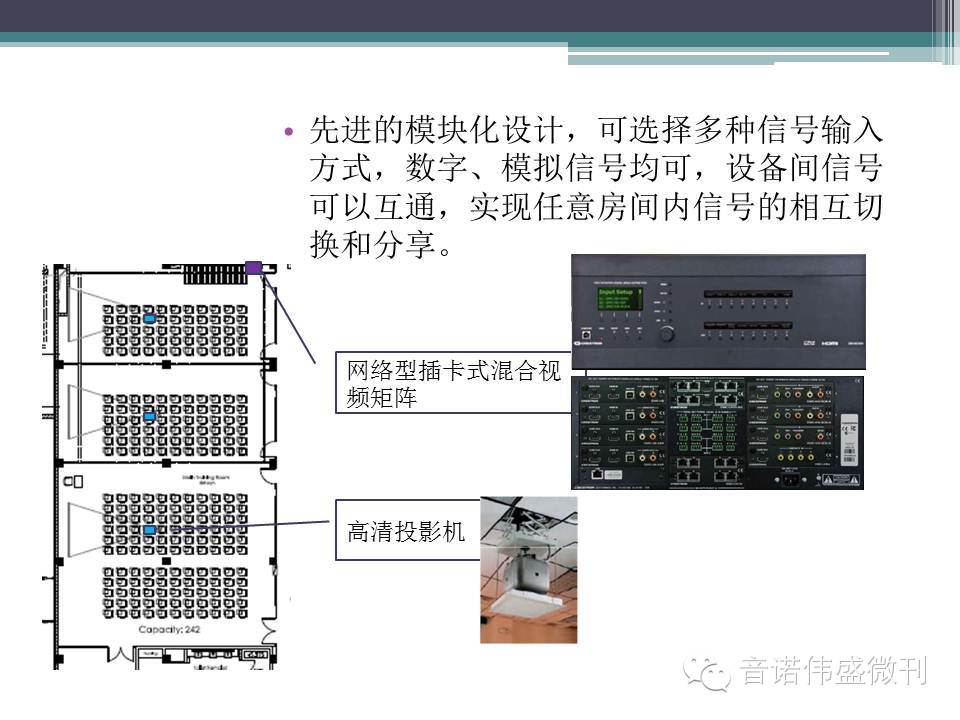 1.配置路數(shù)更多、處理功能更為強(qiáng)大的音、視頻矩陣,能夠滿(mǎn)足分割后各個(gè)單獨(dú)會(huì)議室內(nèi)的音、視頻信號(hào)的處理、分配工作。