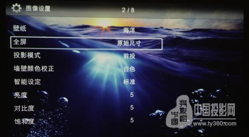 打開設(shè)置菜單,可以看到圖像設(shè)置、視頻設(shè)置、音樂設(shè)置、圖片設(shè)置、節(jié)能模式以及語言設(shè)置等等。在這些設(shè)置中,關(guān)鍵的參數(shù)設(shè)置應(yīng)該說是圖像設(shè)置,在圖像設(shè)置中,用戶可以設(shè)置投影模式、墻壁顏色校正、智能設(shè)定、亮度、對比度和飽和度設(shè)置,而在視頻設(shè)置中并沒有這些參數(shù)的選定,如果用戶想調(diào)整視頻的參數(shù),用戶可以在圖片設(shè)置中搞定。