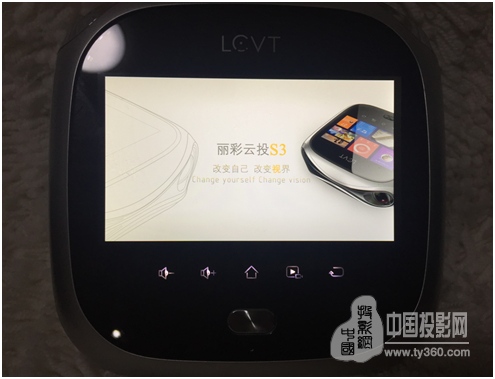 ▲ 按下中間的開機按鈕,麗彩云投S3會利用開機的短暫時間,開啟美圖輪播賞析模式~同時,觸控面板的液晶鍵點亮,從左至右分別是音量鍵、菜單鍵、投影切換以及返回鍵。在這里特別贊一下“投影切換鍵”,它的功能是隨時關閉投影燈,在節(jié)能的同時,也確保了投影畫面的精準性。