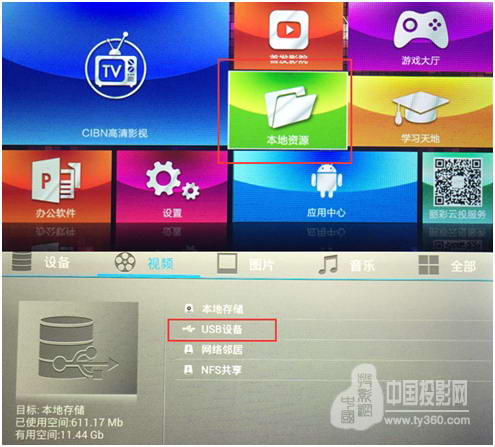 ▲ 使用S3的USB接口,接入移動硬盤(或使用藍牙,直接連接電腦或手機),在本地資源中點選USB設備,即可輕松投放移動設備中的資源。
