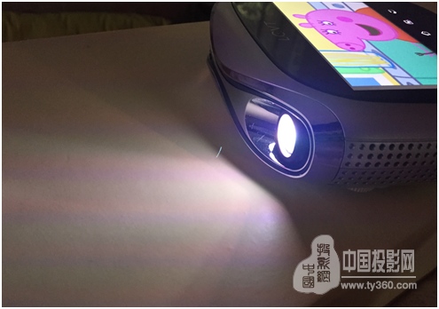 ▲ 將投影儀機身側轉,圖中紅框內(nèi)的“齒輪”就是麗彩云投S3的手動“調(diào)焦環(huán)”。S3的投影覆蓋范圍非常廣,在10-200寸之間,當投影距離改變,投影畫面模糊時,只需輕輕滑動“調(diào)焦環(huán)”,就能實現(xiàn)畫面的清晰對焦,操作簡單,對焦效果甚佳。