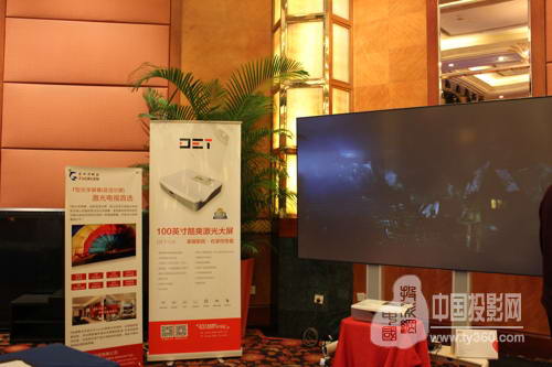 在高峰論壇現(xiàn)場,菲斯特攜手DET,F(xiàn)光學屏幕——激光電視屏幕搭配DET-C6激光電視向到會觀眾展示了激光投影炫麗多彩、無與倫比的魅力。由于菲斯特F光學屏幕具有獨有多層光學結(jié)構(gòu)功能層,可以有效吸收環(huán)境光,呈現(xiàn)高對比度圖像,在明室環(huán)境下觀看效果令人贊嘆!在現(xiàn)場也吸引了眾多業(yè)內(nèi)人士的圍觀。