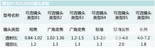 理光PJ KU12000六種可選鏡頭具體參數(shù)