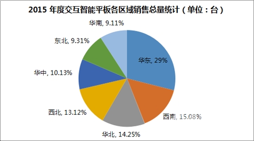 2015 年,我國交互智能平板的銷售主要分布于華北、東北、華東、華南、華中、西南、西北七個區(qū)域。其中華東區(qū)域的市場份額最高,為29%;其次是西南地區(qū),占市場總份額的15.08%。