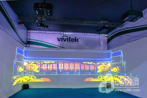 另外三大投影解決方案也異常精彩,主動3D立體投影展區(qū)運用1臺DU9000搭配超短焦變焦鏡頭,使參觀者只需佩戴DLP-Link眼鏡即可欣賞到震撼清晰的3D影像,可應用于影院、展館、博物館等多種室內展示場所;超短焦AR虛擬現(xiàn)實互動投影展區(qū)采用1臺Vivitek(麗訊)超短焦教育投影機D755WTIR,搭配臺達無線互動協(xié)作系統(tǒng)暢想?yún)RNovoPRO,此方案專為企業(yè)和教育應用環(huán)境設計,打造一套便捷互動的商教投影新方案;三折幕展區(qū)采用4臺Vivitek(麗訊)工程投影機DU6675,營造出大場面沉浸式環(huán)境,令觀眾身臨其境,這也是目前很多科技館、博物館和指揮、作戰(zhàn)系統(tǒng)采用的投影方案。