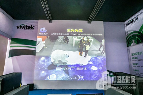 此次Vivitek(麗訊)展示的四大投影解決方案中,最引人矚目的當屬AR虛擬現(xiàn)實展區(qū),與投影畫面中北極熊的互動讓現(xiàn)場觀眾激動不已。此方案采用2臺Vivitek(麗訊)激光工程投影機DU8090Z進行二通道投影融合,搭配新穎的AR虛擬現(xiàn)實互動裝置,打造出具有虛擬現(xiàn)實和互動功能的方案,配合臺達無線簡報設備,可實現(xiàn)有趣的人機互動體驗,這將是展覽展示、教學、交通指揮、部隊作戰(zhàn)等眾多行業(yè)領域未來的主流解決方案。