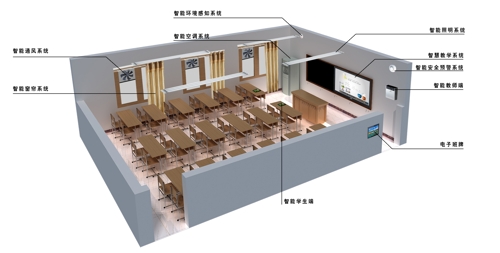 同輝智慧教室方案通過安裝在教室內(nèi)部的監(jiān)測設(shè)備:PM2.5、溫濕度、二氧化碳、光照度傳感器,煙霧報警器、空調(diào)控制器等,對教室環(huán)境進(jìn)行實時監(jiān)測和數(shù)據(jù)記錄,并且根據(jù)真實環(huán)境狀況實現(xiàn)智能控制。比如開啟排風(fēng)扇降低二氧化碳濃度;光線較暗時開燈,光線較亮?xí)r關(guān)閉燈光;根據(jù)溫度高低自動開關(guān)空調(diào);煙霧報警等。