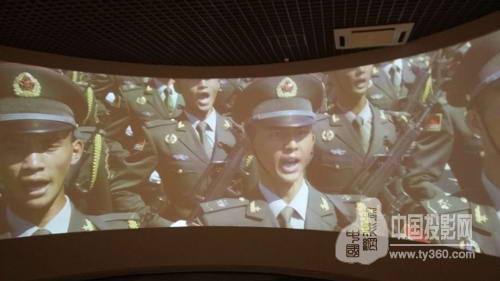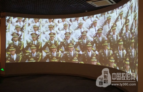 展項使用了3臺SEEMILE激光工程投影機PX700 7000流明 1024*768激光投影機進行7*2米弧形大屏融合,通過大屏融合軟件顯示一個完整的沉浸畫面,視頻播放的是九三大閱兵的場景,通過大屏幕看到中國軍人的雄糾糾氣昂昂的風(fēng)采,充分展現(xiàn)了中國人民解放軍的鋼鐵精神。(看到這小編也被激起男兒參軍報國的熱血哦)