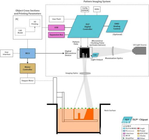 當(dāng)SLA技術(shù)與DLP技術(shù)結(jié)合時,DMD會由UV光源點亮。然后DMD的像素被分別處理,圖像被投影到樹脂層,從而產(chǎn)生一系列截面,這些截面可組成3D物體。采用DLP技術(shù)能夠帶來多種優(yōu)勢,比如能用光學(xué)技術(shù)使來自DMD的各個像素成像,而不是讓光源直接在樹脂上成像,這樣可優(yōu)化分辨率和特征尺寸!緢D像1】