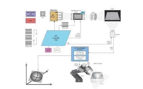 圖像說明:通過提供單個或多個攝像頭的3D圖像采集功能,DLP技術(shù)可實現(xiàn)3D機(jī)器視覺。該系統(tǒng)能將一個DMD用作空間光調(diào)制器,并用一個DMD控制器來提供對微鏡的高速控制功能。