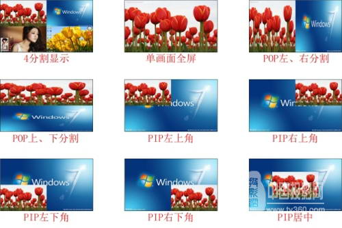 除了四畫面分割顯示和單幅畫面全顯示顯示外,還可支持多種不同的顯示模式,以下為產(chǎn)品所有顯示模式: