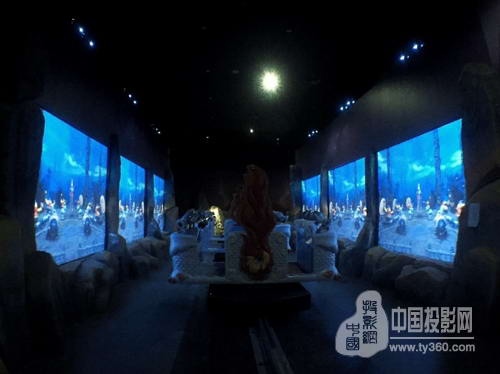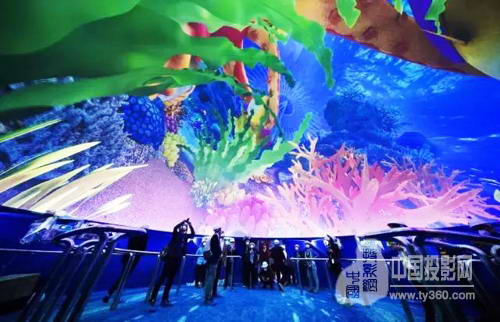4海洋樂園穹幕影院,直徑12米的穹幕,高分辨率顯示,采用十余臺科視投影機,投射出深邃迷人的海底世界。