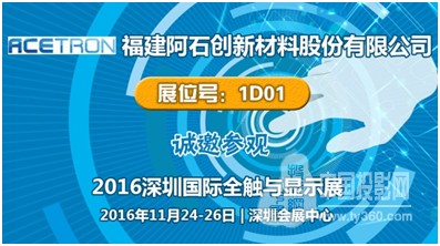 2016年11月24日-26日2016深圳國(guó)際全觸與顯示展將在深圳會(huì)展中心盛大開(kāi)幕。屆時(shí),歡迎業(yè)界同仁來(lái)到福建阿石創(chuàng)新材料股份有限公司位于深圳國(guó)際會(huì)展中心的1D01號(hào)展位參觀與咨詢!