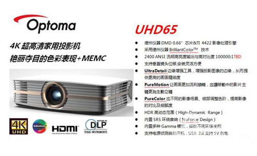 去年,期盼已久的DLP陣營發(fā)力4K家用投影機,并未如期而至。而時至2017年,積攢的一波新品總于即將全面來襲。近日,中國投影網(wǎng)從奧圖碼經(jīng)銷商處了解到,全新4K家用投影機UHD65即將上市,而且還透露了更為全面的信息。