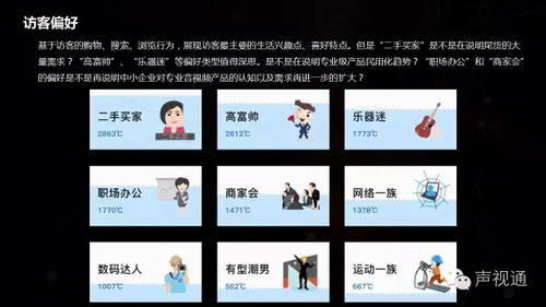 現(xiàn)在關(guān)注行業(yè)產(chǎn)品的人,不再單單是行業(yè)的系統(tǒng)集成商,不再是我們傳統(tǒng)思維意識里的人,而是一些更廣義上的“人”。聲視通通過對自身平臺上訪客的留存數(shù)據(jù)分析,基于訪客的購物、搜索、瀏覽行為,展現(xiàn)訪客最主要的生活興趣點、喜好特點。我們整理的對訪客偏好如圖示中的”二手買家“是不是在說明尾貨的大量需求?”高富帥“、”樂器迷“等偏好類型值得深思。是不是在說明專業(yè)級產(chǎn)品民用化趨勢?”職場辦公“和”商家會“的偏好是不是再說明中小企業(yè)對專業(yè)音視頻產(chǎn)品的認知以及需求再進一步的擴大?