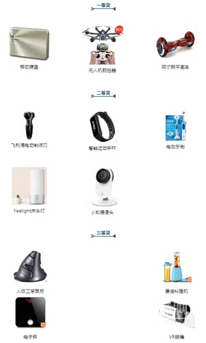 一等獎(jiǎng):移動(dòng)硬盤(pán)、無(wú)人機(jī)航拍器、阿爾朗平衡車(chē)