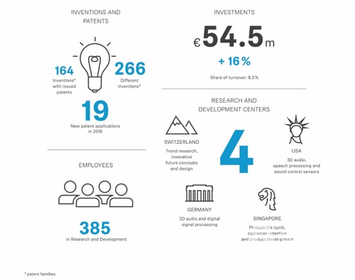 Sennheiser集團再次提高研發(fā)投資,比上年增加16%,達到5,450萬歐元。研發(fā)開支占營業(yè)額的8.3%。四個研發(fā)中心總共有385名員工。