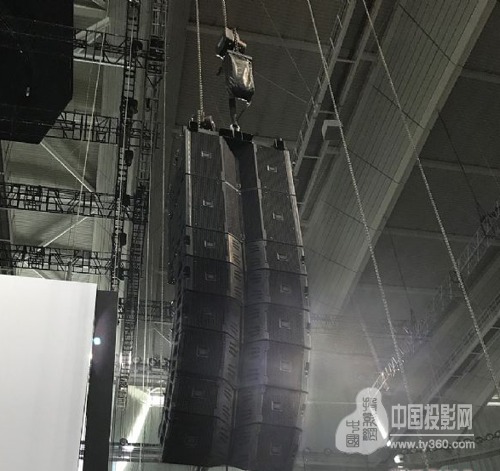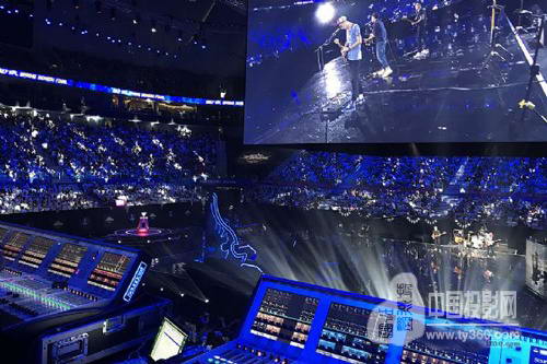 現(xiàn)場擴聲系統(tǒng),共使用到了94只JBL揚聲器。選用8組JBL VTX V20雙10寸線陣列揚聲器吊裝在四面的舞臺上,在主觀眾席面V20上一共吊掛了同系列的VTX S25雙15寸超低音揚聲器。