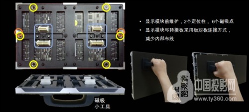 完全前安裝和前維護是“極光”系列的又一大亮點,顯示模塊與轉接板采用板對板連接方式,減少內(nèi)部布線,箱體內(nèi)所有零件均可實現(xiàn)屏體正面維護,有效減少屏體安裝空間85%,無需背面預留安裝空間,真正實現(xiàn)靠墻安裝,空間利用率最大化。同時,使用磁吸工具,一個人便可完成所有的安裝和維護。