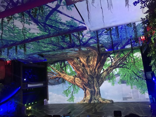 天幕投影的中間區(qū)域則應(yīng)用了1臺松下PT-SDS20K2C和1臺松下PT-FDX110C做疊加,左右兩側(cè)使用了2臺PT-FDX92C和4臺PT-FD601CL進(jìn)行投射。
