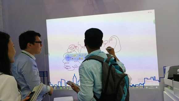 電子白板使用的艾博德超短焦激光投影機(jī),投射100寸畫面時,機(jī)器離畫面的距離只需要6厘米,效果震撼;先進(jìn)的圖像處理
