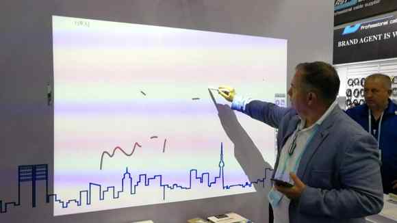 電子白板展區(qū)更是吸引了眾多客戶前來體驗,而它的原理是將小方盒接收器安裝在投影區(qū)域側(cè)邊中間位置,然后通過超聲波
