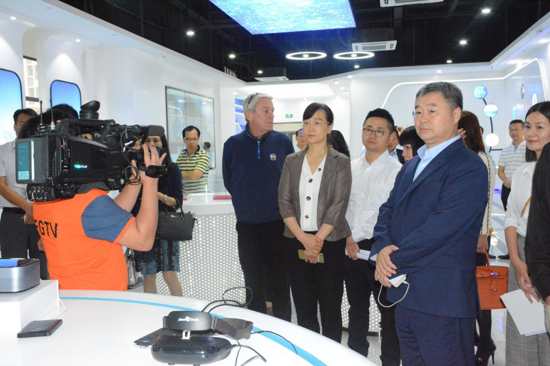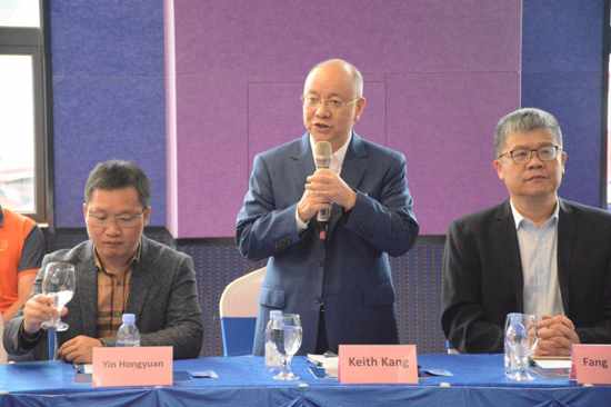 (東莞市副秘書長周婉虹、鉅成集團董事長薛成標(biāo)聆聽康總介紹展品)