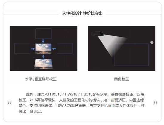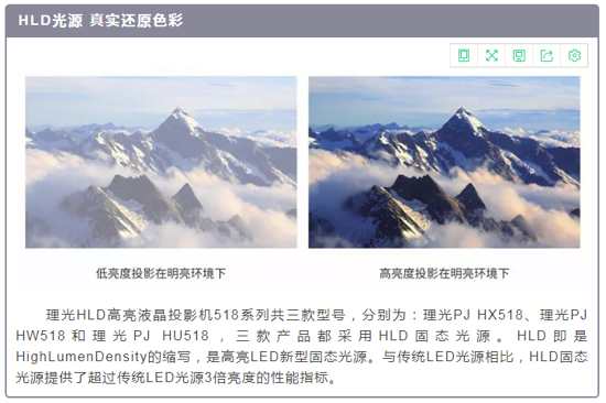 采用了HLD LED光源的理光518系列產(chǎn)品,其中理光PJ HX518可投射5200流明亮度、理光PJ HW518和理光PJ HU518最大輸出亮度可達5000流明,擁有2,500,000:1的高對比度,光源壽命高達20,000小時,因此在投影機使用生命周期內(nèi)免除了用戶更換光源的問題,節(jié)省了大量成本。