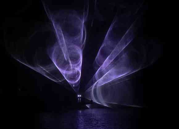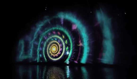 在表現(xiàn)形式中,選擇了新穎并具有極佳宣傳效果的水幕投影。所謂水幕,是通過高壓水泵和特制的水幕發(fā)生器,將水自下而上高速噴出,霧化后形成的“銀幕”,再由投影、燈光等機(jī)械設(shè)備將視頻投射在“銀幕”上,形成了水幕投影。