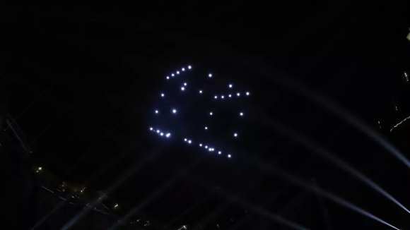 第三篇聆聽萬物回響,42架無人機(jī)閃光起航,配合音樂的節(jié)奏在空中編織出生命的舞蹈,一只來自宇宙深處的眼睛在夜空中與觀眾的眼睛遙遙相對,提醒我們傾聽來自自己內(nèi)心的回響。