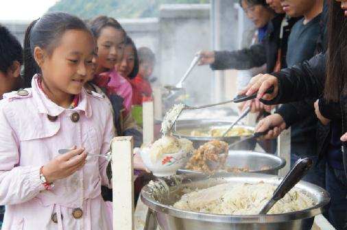 二是孩子們的營養(yǎng)午餐。學(xué)校給孩子們提供一頓營養(yǎng)午餐,兩素一葷一湯。到午飯時間,校園里一下熱鬧了起來,只見孩子們拿著餐具笑說著歡快地來到食堂門前,又規(guī)規(guī)矩矩地排隊打飯。10月中旬的果珠鄉(xiāng)陰冷、潮濕,但飯菜熱氣騰騰。孩子們臉上洋溢著企盼,打好飯菜后一個個心滿意足。
