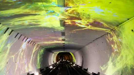 上海外灘觀光隧道是我國(guó)第一條越江行人隧道,全長(zhǎng)646.70米,2000年10月開(kāi)通,于近期進(jìn)行了部分路段的改造。視美樂(lè)有幸參與其中,使用28臺(tái)激光投影機(jī)對(duì)兩段共計(jì)77米長(zhǎng)的隧道進(jìn)行了光影改造,給隧道觀光旅程增添別樣的樂(lè)趣。從進(jìn)入地底到最終躍出地面飛向宇宙,給游客帶來(lái)一段豐富完整的冒險(xiǎn)之旅。
