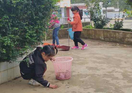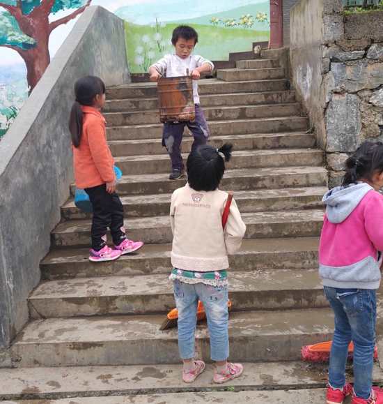 不一會(huì)兒孩子們上午的課程就結(jié)束了,因?yàn)楹⒆觽冸x家比較遠(yuǎn),所以都會(huì)在學(xué)校吃午飯。那天剛好是一周一次的大掃除日,孩子們需要先清潔校園,然后才吃午飯。一個(gè)個(gè)比掃帚矮一大截的小朋友,沒(méi)人指揮、沒(méi)人監(jiān)督,都自覺(jué)認(rèn)真地清掃校園,當(dāng)天的溫度在10度左右,我穿著羽絨服幫忙掃樹(shù)葉都覺(jué)得冷冷的,可是有的小朋友就穿了一兩件單薄的衣服,流著鼻涕,小手凍的紅紅的,還在地上撿樹(shù)葉、掃樓梯、擦門窗。看著一個(gè)個(gè)忙碌的小身影,我很心痛,到底是怎樣一種生活環(huán)境,才讓他們有著這般和年紀(jì)不符的成熟懂事啊。