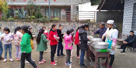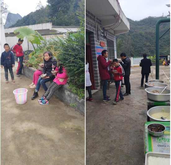 午飯時(shí)間到,廚房的阿姨把飯菜端到操場(chǎng)上,小朋友們自覺(jué)的拿著餐具排起了長(zhǎng)隊(duì),大家捧著飯菜,在沒(méi)有桌椅的操場(chǎng)上,坐在樓梯邊的、蹲在地上的、倚在墻邊的,沒(méi)有吵鬧、沒(méi)有挑食、沒(méi)有浪費(fèi),老師和孩子們一起開(kāi)心的吃著“豐盛”的午飯。