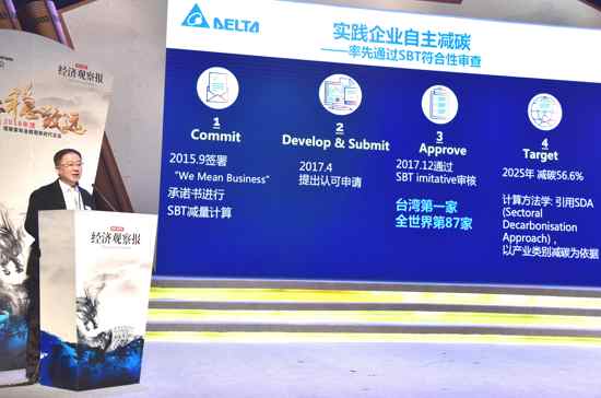 臺達發(fā)言人暨企業(yè)永續(xù)發(fā)展部資深協(xié)理周志宏代表領獎,并以”綠色企業(yè) 永續(xù)發(fā)展”為題分享臺達經(jīng)驗。他表示,臺達深信要成為一家永續(xù)經(jīng)營的企業(yè),在追求營收成長的同時,更要重視企業(yè)社會責任,才能行穩(wěn)致遠。臺達積極參與國際倡議減碳活動,扮演世界級企業(yè)公民,已連續(xù)12年參與聯(lián)合國氣候變化大會,今年更在波蘭舉行的COP24期間,邀約國際知名智庫主辦官方周邊會議、參與永續(xù)創(chuàng)新論壇(Sustainable Innovation Forum, SIF),和來自全球各地的意見領袖交流,創(chuàng)新科技如何帶來可持續(xù)發(fā)展。 為積極響應“We Mean Business”企業(yè)自主承諾,臺達率先以科學化方法訂定減碳目標(SBT),制定2025年碳密集度下降56.6%的目標,并通過科學基礎目標倡議組織符合性審查,成為中國大陸及臺灣地區(qū)第一家、全世界第87家通過審核的企業(yè)。