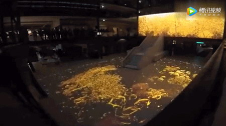 沿著臺階順流而下的藍色大水瞬間組成翻騰著一朵朵浪花的湖面,緊接著又形成一個巨大的深不見底的黑洞將大水吞噬。同一空間里不同層次的屏幕相交呼應,一片金黃色的樹林對應著一朵朵金光閃閃爭相開放的花朵。沉浸式的立體投影總能給人更廣闊更震撼的體驗,眼睛和心要隨時準備迎接下一秒的驚喜。