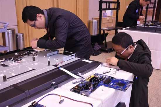 極速拆裝是工程師給用戶提供高效服務(wù)體驗的必備技能,兩人一組在規(guī)定的時間內(nèi)完成整機(jī)拆裝,講究的是快而準(zhǔn)地完成合作。工程師們你拆我裝、你遞工具我接線,動作一氣呵成,配合得天衣無縫?简灥牟恢皇工程師的實踐能力,還有協(xié)同合作的意識。除此之外,個人還要對希沃常態(tài)化錄播、希沃云班牌、希沃易課堂等產(chǎn)品進(jìn)行全面的考核,對應(yīng)用軟件的相關(guān)功能進(jìn)行演示及講解,對教學(xué)輔助設(shè)備的調(diào)試等,充分考驗每一位工程師的綜合能力。