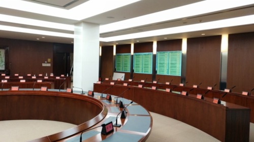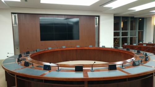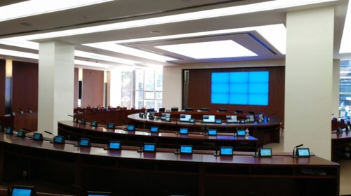成都市政府101會(huì)議室是進(jìn)行每周常務(wù)會(huì)議及工作會(huì)議的重要場(chǎng)所,使用頻率高,會(huì)議室以圓桌加扇形桌擺放形式,坐席為103個(gè),均需要鵝頸會(huì)議話筒,且需要103支話筒全開,發(fā)言完畢才會(huì)關(guān)閉話筒,原系統(tǒng)使用音柱揚(yáng)聲器兩只,聲場(chǎng)均勻度差,語(yǔ)言清晰度差,且容易產(chǎn)生嘯叫,不能滿足客戶使用需求。