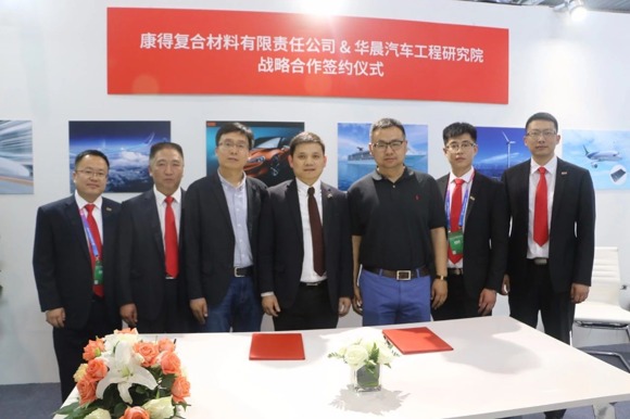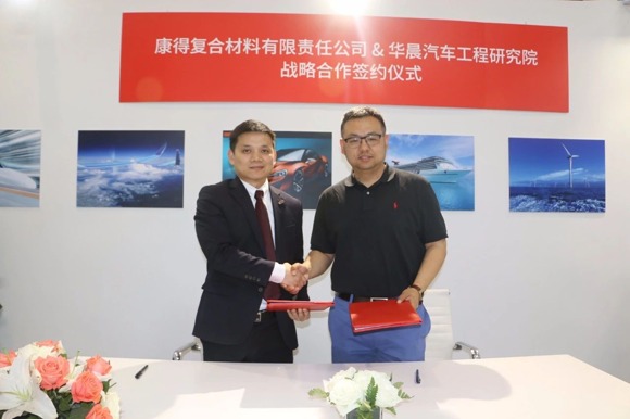 康得復(fù)材副總裁、輕量化技術(shù)研究院院長何鵬、華晨汽車工程研究院前期開發(fā)部部長王隆宇代表雙方公司簽署戰(zhàn)略合作協(xié)議