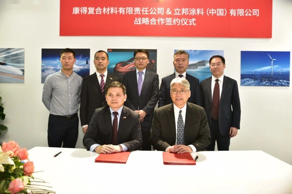 4月27日上午, 康得復(fù)材與立邦涂料舉行戰(zhàn)略合作簽約儀式,康得復(fù)合材料公司副總裁、CTO何鵬博士(前排左),立邦涂料母公司新加坡立時(shí)集團(tuán)CTO洪江博士(前排右),代表雙方企業(yè)出席簽約儀式。
