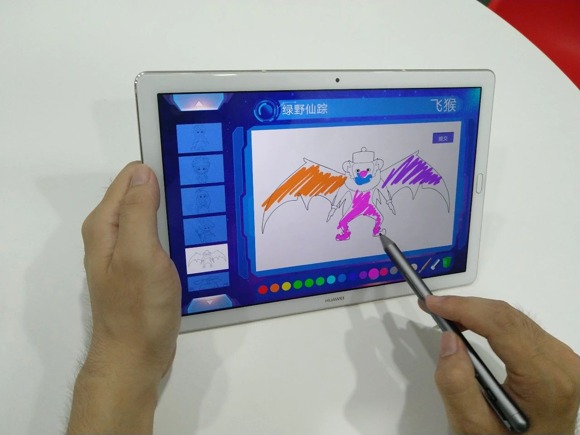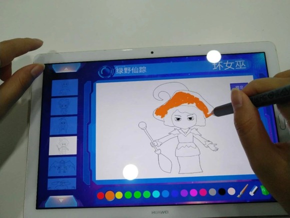 在兒童體驗區(qū),家長和小朋友們坐在一起,拿著華為PAD給選好的角色涂色。他們盡情發(fā)揮想象力,用多彩的顏色讓自己的圖案與眾不同。不一會兒功夫,桃樂絲、鐵皮人、小獅子等故事人物就色彩艷麗地出現(xiàn)屏幕上。