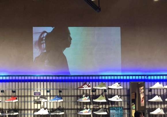 如果靜態(tài)陳列的鞋子無(wú)法讓你想象在球場(chǎng)上馳騁、在地鐵中穿行的肆意暢快,不如抬頭看看模特們?cè)谡鎸?shí)生活環(huán)境中的體驗(yàn)。多方位的動(dòng)態(tài)投影展示,不僅將產(chǎn)品與顧客實(shí)際的穿著情境相結(jié)合,帶給顧客超強(qiáng)的運(yùn)動(dòng)沖動(dòng)感和認(rèn)同感,同時(shí)高效地傳達(dá)了產(chǎn)品信息,進(jìn)而促進(jìn)產(chǎn)品的銷售轉(zhuǎn)化。