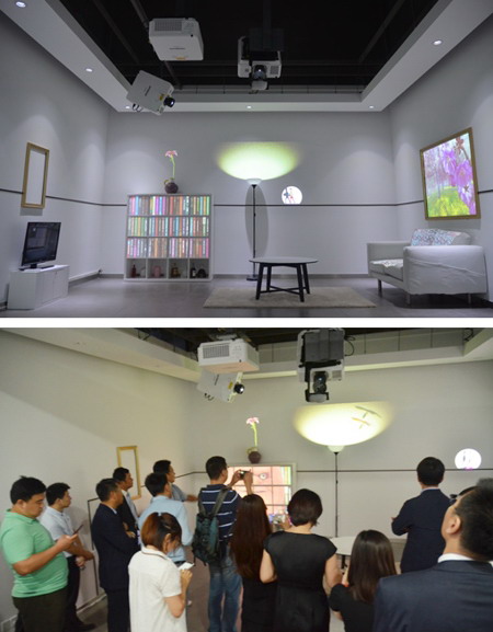 客廳方案使用能在指定空間中讓投影自由動起來的活動鏡面來進行“活躍”的家居光雕投影展示。3臺TCP-WL6000U激光光源投影機進行空間光雕投影,1臺Mirror Head(投影機專用鏡面影像轉(zhuǎn)換器)讓虛擬人物在空間中自由動起來。